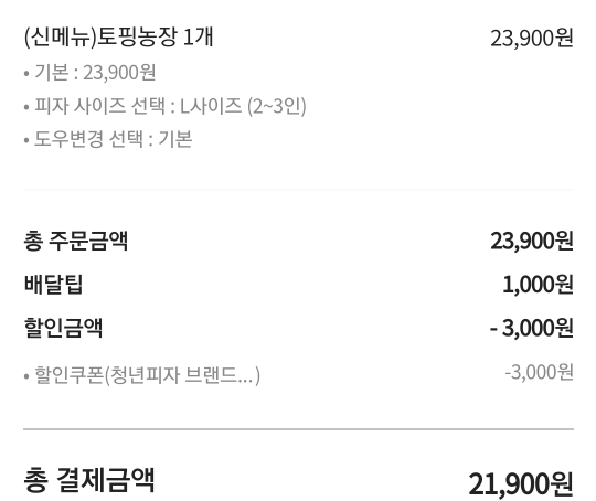 나는 할인쿠폰 사용해서 피자 값은 20,900원에 주문했다.