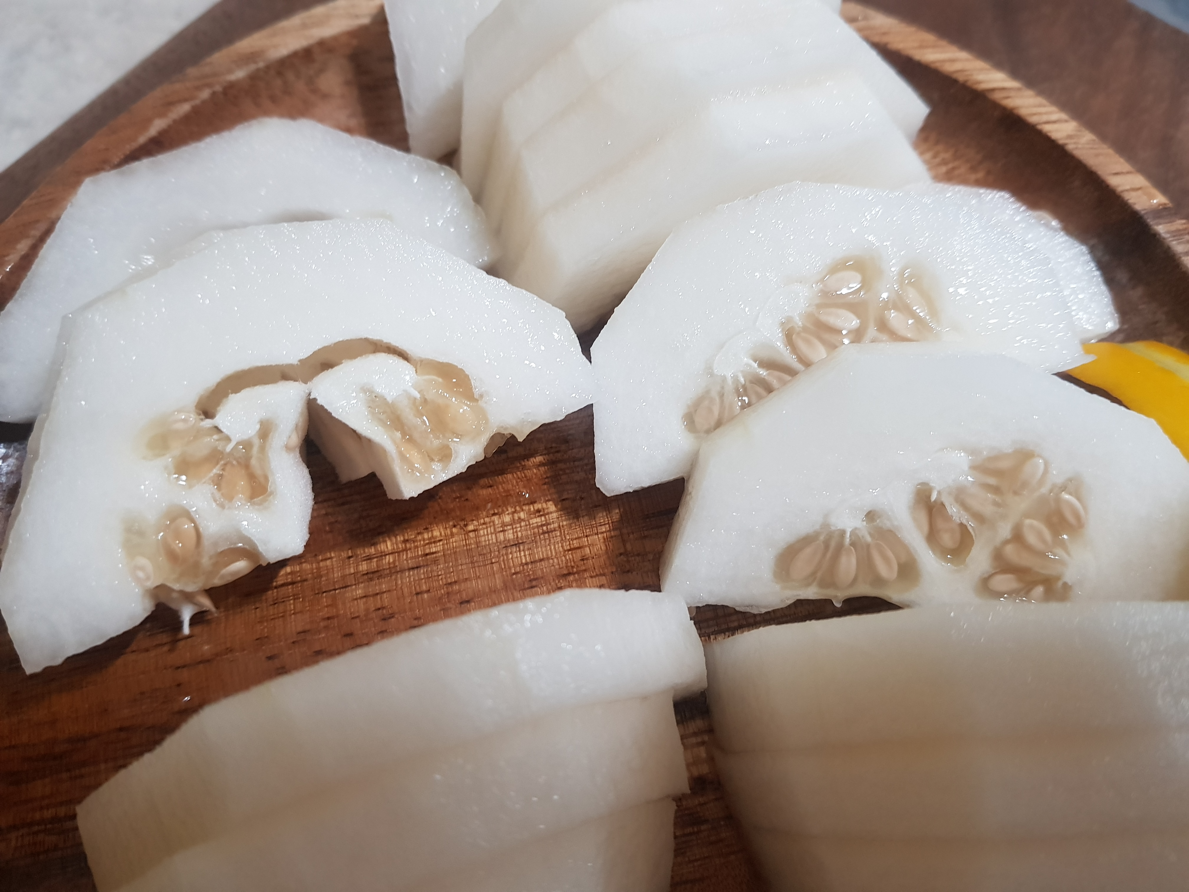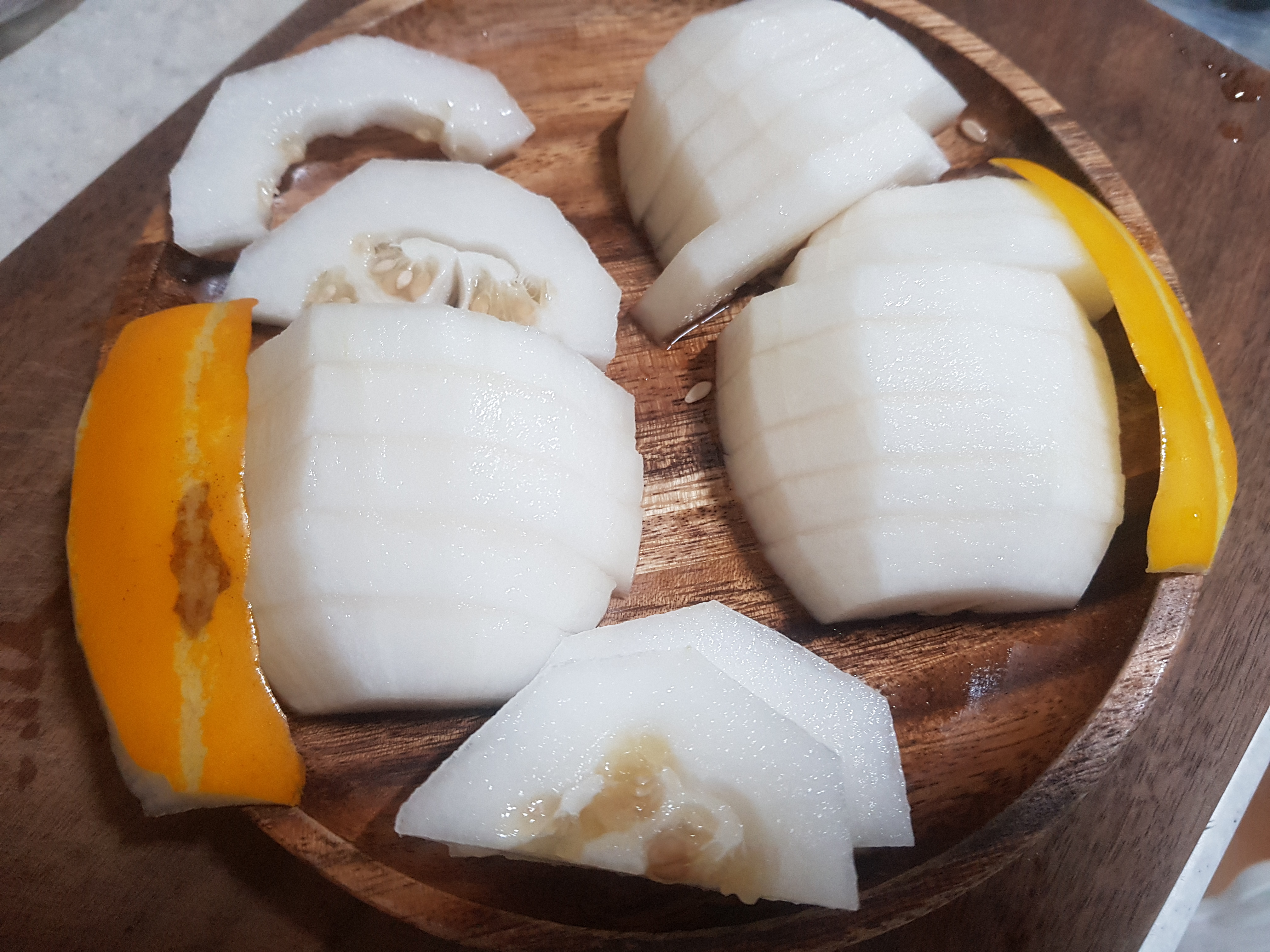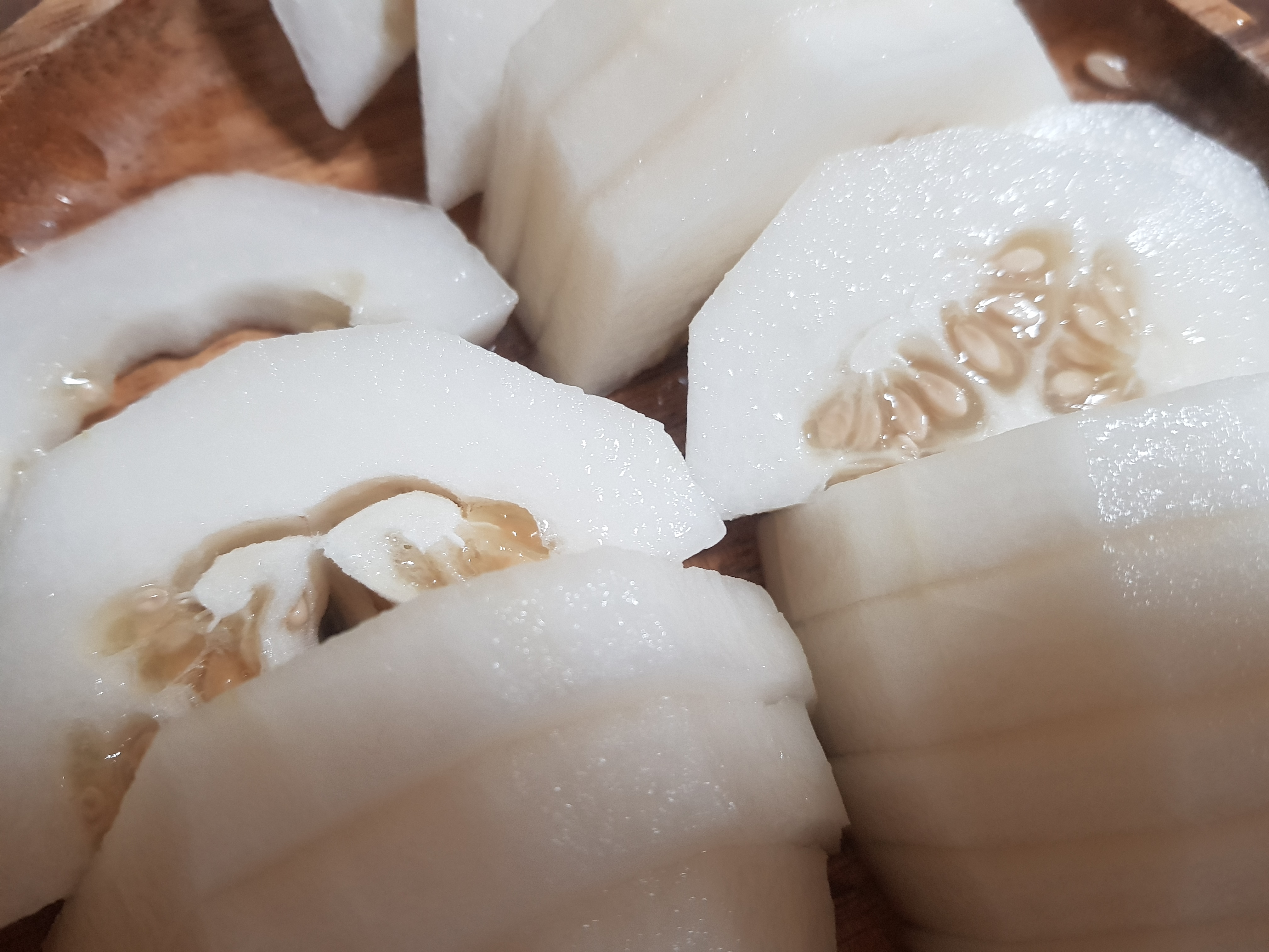 맛있는 참외는 씨 주변으로 하얀 게 꽉 차있다.