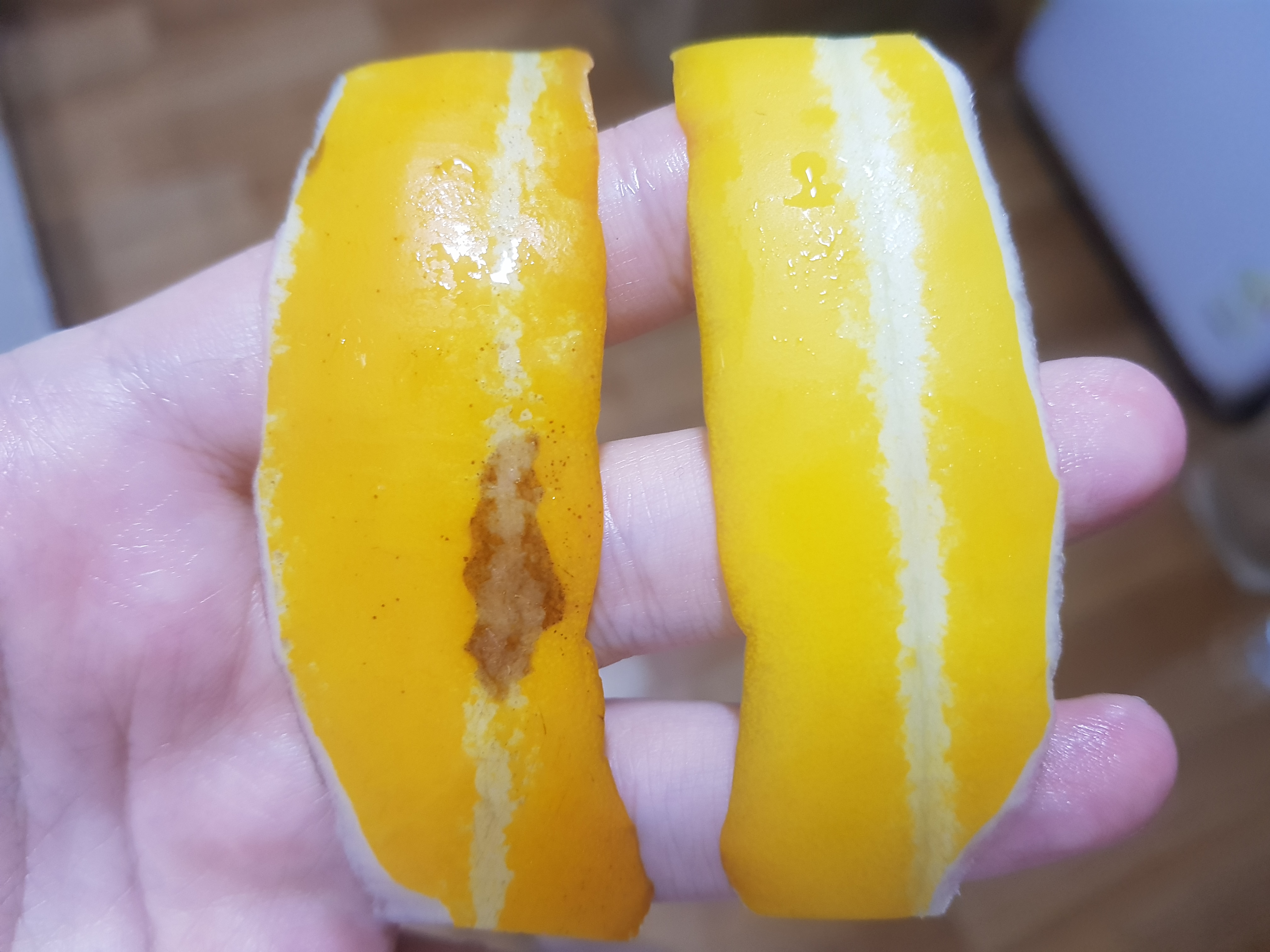 생각 없이 깎고 나니 두 참외의 맛 차이가 너무 나서 부랴부랴 찍은 사진이다.